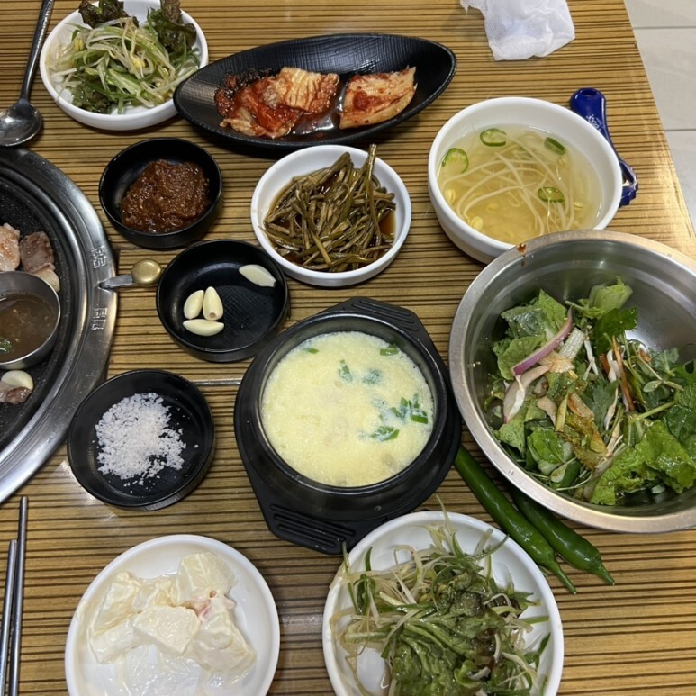 장아찌, 마늘, 쌈장, 샐러드 등등