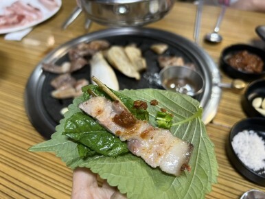 맛있게 잘 익은 뒷고기 한점 소금 살짝 찍어 한입 냠