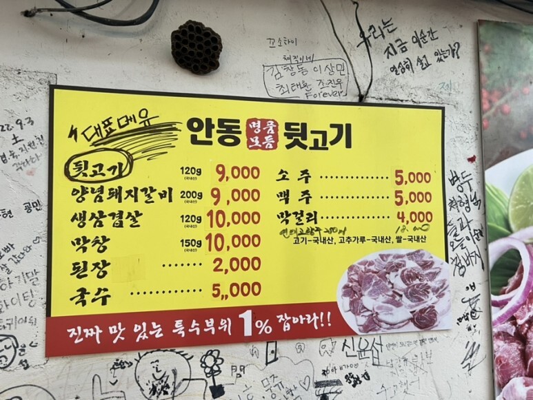 뒷고기, 양념돼지갈비, 생삼겹살, 막창